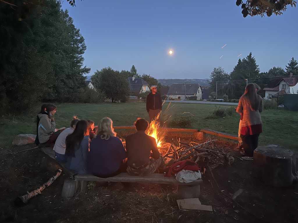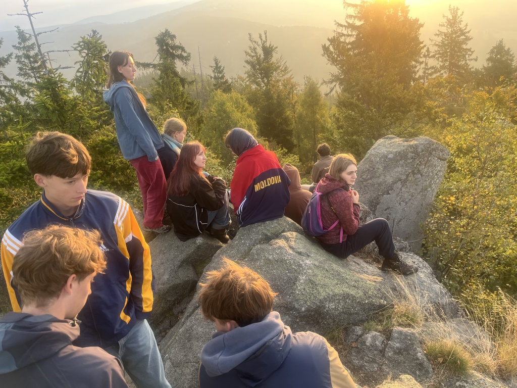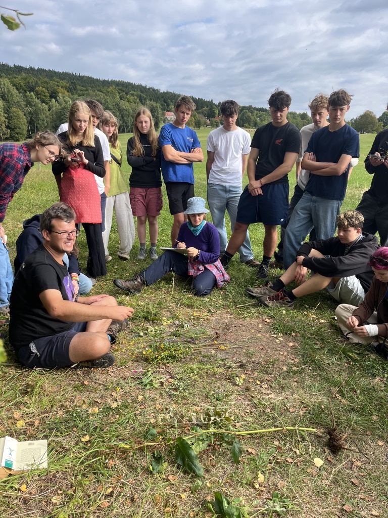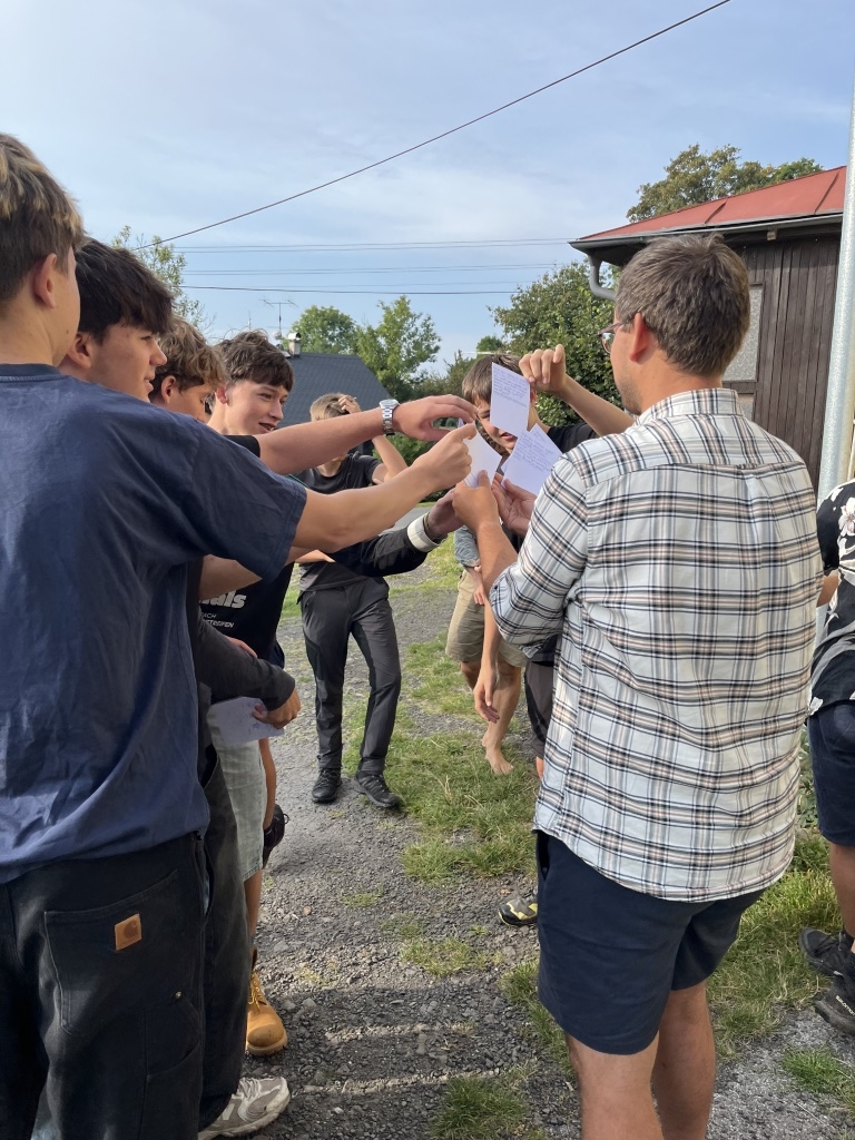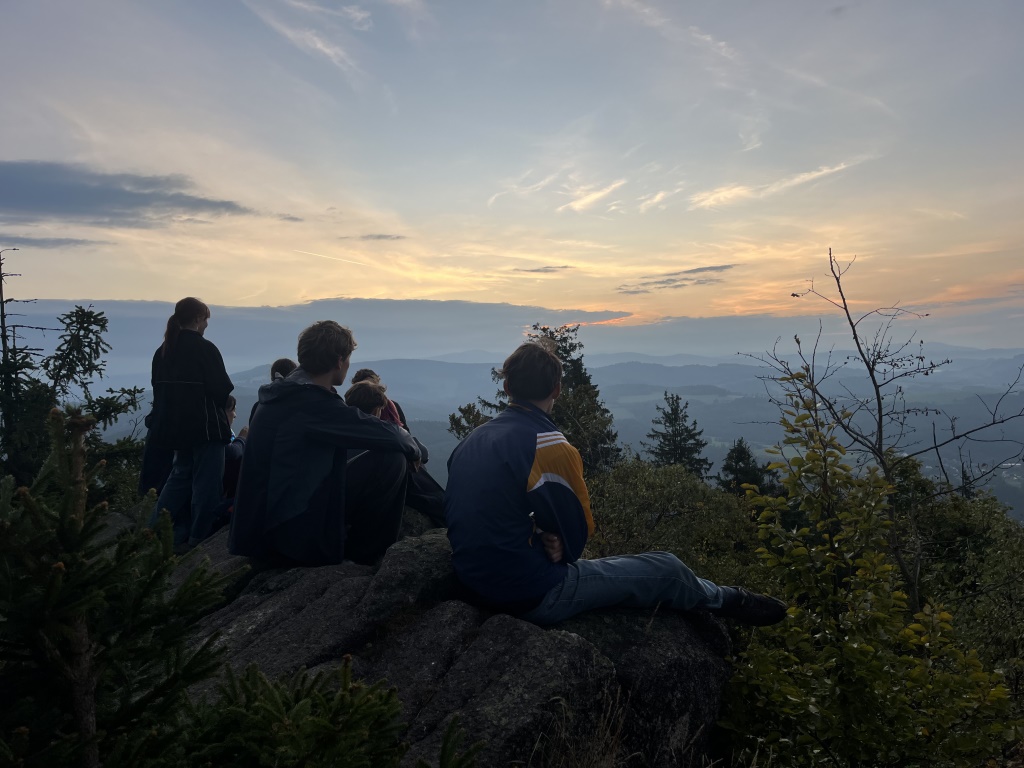 Všechno to začalo druhý školní den, tedy v úterý druhého září dva tisíce dvacet pět, když jsme se místo ve školních lavicích na opatovském sídlišti setkali uprostřed sherwoodského lesa v zastrčené uličce hlavního nádraží za Luxorem. Po četných zpožděních a neohlášených objížďkách jsme konečně v mírném dešti stanuli na zastávce Velké Hamry a čekal nás asi čtyř kilometrový výstup do vesničky Zásada, ze které šlo krásně přehlédnout snad celé podhůří Jizerských hor. Ubytovali jsme se ve veliké budově bývalé školy teď už kompletně přestavěné na pension.