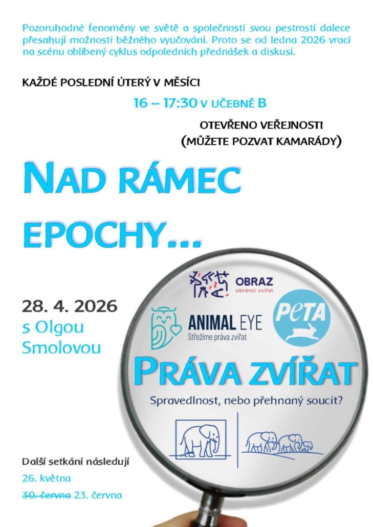 V dalším dílu Nad rámec epochy… se společně s Olgou Smolovou zamyslíme nad následujícími otázkami. Kdy a proč se začala objevovat myšlenka práv zvířat? Z čeho vychází a je obhajitelná? A má dnes vůbec smysl se zvířecími právy zabývat?